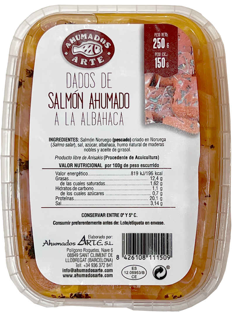 SALMÓN AHUM.DADOS Aceite/albahaca 250gr. PESO NETO (ARTE)